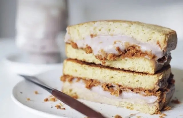 7.烤好取出晾涼,取一片擠上沙拉醬,然后用另一片蓋上,然后在雙面都擠滿沙拉醬。8.最后裹上滿滿的肉松就做好啦。